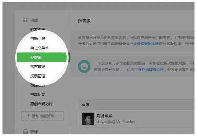 新版网页客服功能,具体功能和使用指引详见微信公众平台公告和微信多客服使用指南。